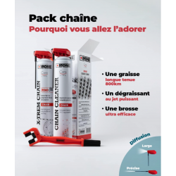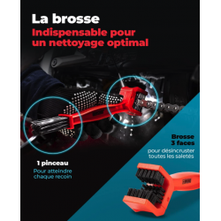 BROSSE CHAÎNE : Fournie dans ce pack, la brosse de chaîne permet un nettoyage optimal de la chaîne et du pignon. Grâce à sa tête à trois faces, elle désincruste toutes les graisses et autres salissures même les plus tenaces. La partie pinceau quant à elle permet d’atteindre chaque petit recoin.