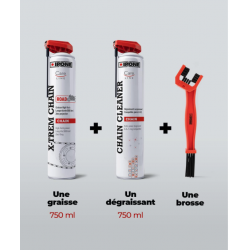 UN NETTOYAGE DE CHAÎNE COMPLET : Grâce à votre PACK CHAINE ROUTE, entretenez votre chaîne de moto de A à Z en alliant un dégraissant chaîne efficace contre les graisses les plus tenaces, accompagné de sa brosse et une graisse de chaîne route tenue longue tenue - 800 km - dans des conditions extrêmes.